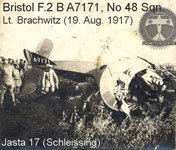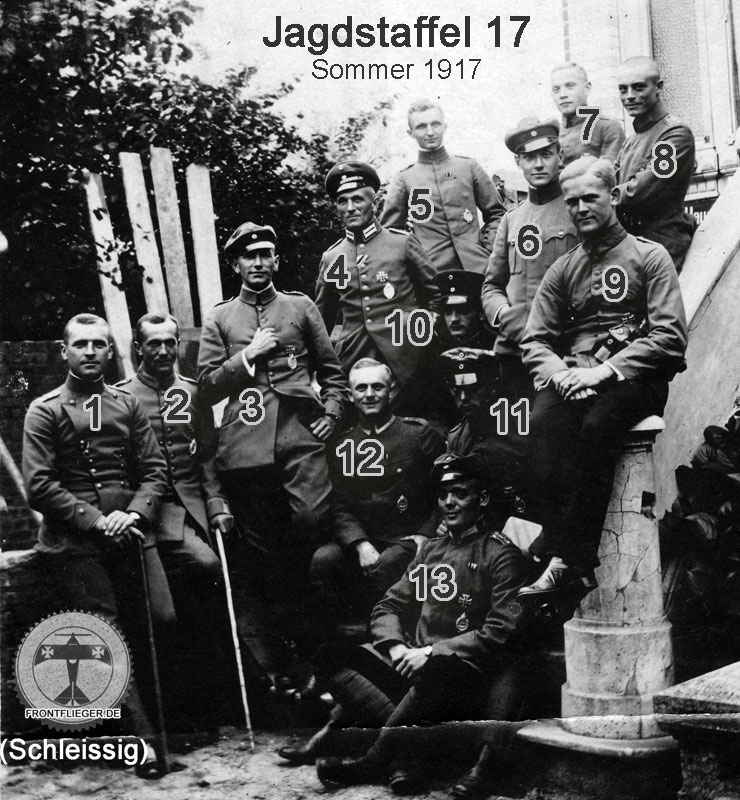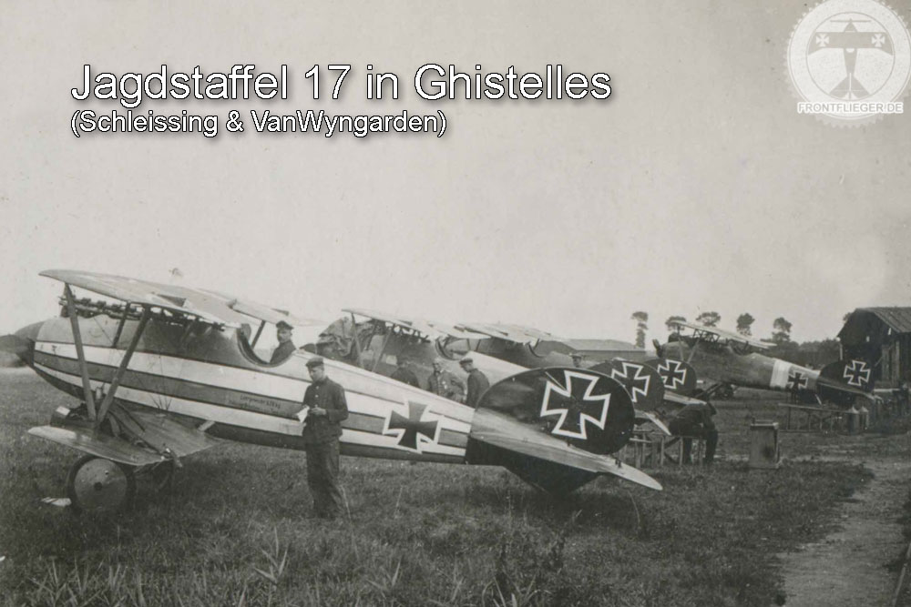 Flugzeuge der Jasta 17 bei Kriegsende. In die Heimat flogen: Fokker D VII 773/18, Fokker D VII 804/18, Fokker D VII 805/18, Fokker D VII 5211/18, Fokker D VII 5216/18, Fokker D VII 6329/18, Fokker D VII 6357/18, Fokker D VII 6587/18 und Fokker D VII 6596/18 Zurück gelassen wurden folgend Maschinen: Fokker D VII 871/18, Fokker D VII 5202/18, Fokker D VII 5438/18, Fokker D VII 5454/18, Fokker D VII 6591/18, Fokker D VII 6592/18 und Pfalz D XII 2623/18 Quartier: