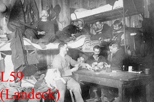 ![]() Die Besatzung des L59 in dienstfreier Zeit. Aus dem Deutschen Soldatenkalender 1957: 'Als im Spätherbst des Jahres 1917 der Widerstand der kleinen deutschen Schutztruppe in Deutsch-Ostafrika unter von Lettow-Vorbeck gegen die Übermacht der Engländer und Portugiesen zu erlahmen drohte, entwickelte von seinem Arbeitszimmer im Reichskolonialamt der frühere Oberstabsarzt der Schutztruppe, Prof. Dr. Zupitza, [...] einen Plan, wie man der tapferen Truppe in den fieberverseuchten Tropen auf dem Luftwege die so notwendigen Medikamente sowie Munition und Verpflegung zuführen konnte. Nicht zuletzt durch die Autorität des greisen Afrikaforschers Georg Schweinfurth gelang es schließlich, die deutsche Admiralität zu überzeugen, dass der Einsatz eines ihrer Marine-Luftschiffe durchaus erfolgversprechend sei. Das auf der Werft in Staaken im Bau befindliche Luftschiff L 59 wurde deshalb um 30 Meter verlängert und mit fünf besonders starken Maybach-Motoren ausgerüstet. Es konnte schon am 25. Oktober 1917 unter seinem Kommandanten Käpitänleutnant Ludwig Bockholt in Dienst gestellt werden. Mit einer Ladung von vier Eisenbahnwaggons an Bord, darunter 311.000 Patronen und 30 Maschinengewehren, wurde das Luftschiff in einer 28-stündigen Fahrt nach Jambol in Bulgarien, dem deutschen Zeppelinstützpunkt auf dem Balkan, überführt. Auf dieser Fahrt befand sich auch Dr. [Hugo] Eckener an Bord. Wegen der Unmöglichkeit einer Treibstoffversorgung und eines Ausgleichs des Gasverlustes in der Kolonie war eine Rückführung des Luftschiffes nach durchgeführtem Auftrag von vornherein ausgeschlossen, sodass man bemüht sein musste, sebst die Teile der Luftschiffhaut und des Gerüsts möglichst zweckmäßig für die Truppe in Afrika zur Verwendung zu bringen. Nach einer ersten Ausfahrt am 16. November musst das Luftschiff wegen ungünstiger Wetterlage nach einer Fahrtzeit von 22 Stunden in seinen Balkanhafen zurückkehren, um besseres Wetter abzuwarten. Endlich konnte am 21. November um fünf Uhr morgens der Aufstieg mit dem Zeil Makonde-Hochland in Ostafrika [heute: Tansania], wo man Lettow-Vorbeck vermutete, erfolgen. Der vorraussichtliche Reiseweg betrug 6.757 Kilometer. An Bord befanden sich Prof. Zupitza sowie der Fallschirmspringer Grussendorff [...]. Mit Kurs Adrianopel, das Schwarze Meer umgehend, zog das Luftschiff über die uralte Heerstraße römischer Legionen nach Konstantinopel [heute: Istambul], stieß dann auf das Mittelmeer vor und flog im Geleit einer Kampfstaffel der deutschen Fliegerbesatzung von Smyrna über Kreta zur afrikanischen Küste. In 1.000 Metern Höhe geing es in beschwerlicher Fahrt über die libysche Wüste und über den Sudan entlang der silbernen Gabel des weißen und blauen Nils dahin. Da erreicht den Kommandanten ein Funkspruch der Großfunkstation Nauen, der ihm den Befehl zur sofortigen Rückkehr übermittelt, da man infolge einer Falschmeldung annahm, dass die tapfere Schutzstruppe Ostafrikas kapituliert hätte. [...] Nach vielfachen Gefahren landete das Luftschiff am 25. November, 8:15 Uhr morgens, nach einer Fahrt von 95 Stunden über drei Erdteile hinweg [...] wieder in seinem Hafen. [Das Ende:] Am 7. April 1918 ereilte aber das deutsche Afrika-Luftschiff und seine einsatzfreudige Besatzung bei einem Vorstoß das Fliegerschicksal. In der Straße von Otranto soll es von einem englischen Zerstörer abgeschossen worden sein. Das deutsche Unterseeboot U53, dass den Luftkreuzer nach kurz vorher gesehen hatte, suchte die Stätte des Unheils vergeblich nach Überlebenden ab. Die tapfere Besatzung hatte ohne Ausnahme den Heldentod gefunden. Im Park von Jambol an der Tundscha errichtete man ihr einen Gedenkstein.' Eine zweite Quelle geht davon aus, dass es infolge einer defekten Benzinleitung zu einem Feuer an Bord kam und das Luftschiff innerhalb einer Viertelstunde komplett verbrannte. Eine dritte Quelle geht davon aus, dass das Luftschiff von italienischer Küstenartillerie in Brand geschossen worden war. Eine Klärung dieser Variante steht noch aus. |