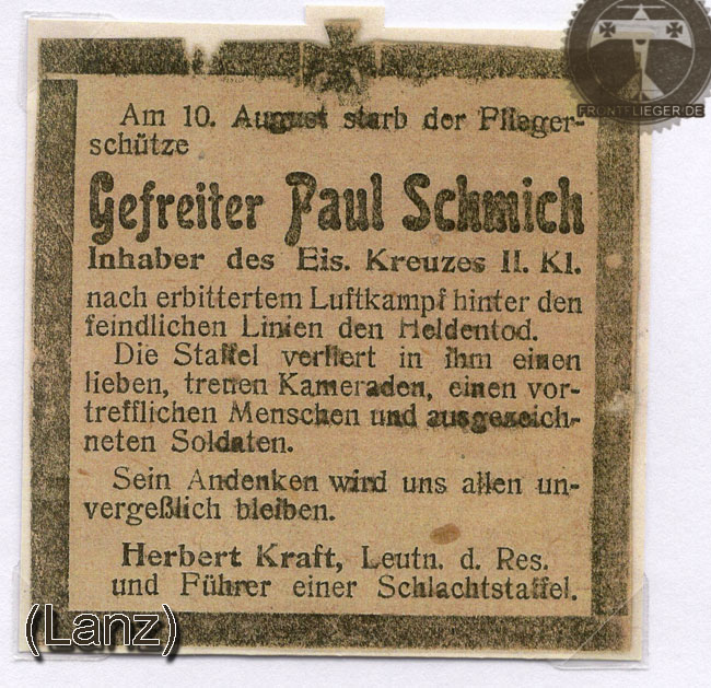 Paul Schmich (Bordschütze) starben bei einem Tiefangriff auf anrückende britische und französische Verbände im Zuge der alliierten Großoffensive zwischen Albert und Compiègne (am 10. August 1918). Sie wurden von Einsitzern brennend abgeschossen. Ihr Grab ist unbekannt. Ihre Gebeine ruhen wohl im Kameradengrab Vermandovillers. Sie flogen die Machine No. 3 (vermutliche eine Hannover CL). Todesanzeige der Familie Schmich. Todesanzeige der Staffel (für Schmich). |