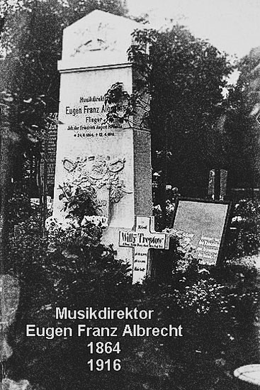 Eugen Franz Albrecht war vor dem Krieg Musikdirektor an der von ihm gegründeten 'Musik-Akademie für Klavier, Zither und Violine' in der Oranienstraße 63 II in Berlin. -- Über seine Verwendung im Krieg ist bisher nichts bekannt - auf dem Grabstein ist er als Träger der Friedrich-August-Medaille (Königreich Sachsen) ausgewiesen. Er starb an einer Krankheit/ Verwundung in seiner Heimatstadt. |
