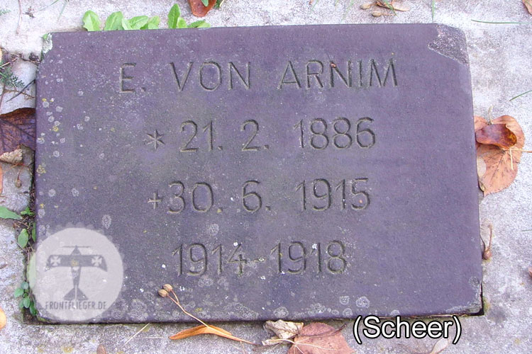 Er war aktiver Offizier im Regiment Jäger zu Pferde Nr. 10 (ursprünglich Kürassier-Rgt. Nr. 3). Er starb als Beobachter beim AFP Gallwitz - befand sich eventuell gerade auf dem Weg zu einer Front-Abteilung. Der AFP Gallwitz befand sich vermutlich in Preussisch Eylau (Westpreußen) - Mit von Arnim fiel sein Flugzeugführer Bruno Pesch. -- Zwei Jahre später fiel auch der ältere Bruder Bernd - somit erlosch dieser Zweig der Familie von Arnim. |
