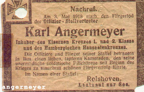 Offizier im Infanterie-Rgt. Nr. 145. Er flog als Beobachter - sein Flugzeugführer war Alfred Klemm Todesanzeige. |