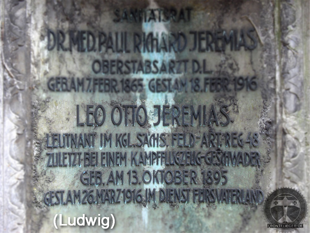 Sein Vater war Oberstabsarzt d. Lw. und starb wenige Wochen vor seinem Sohn. Leo Otto Jeremias war Offizier im sächsischen Artillerie-Regiment Nr. 48 und fiel als Beobachter im Kagohl 3, ggf. starb er bei der Ausbildung oder aus einem anderen Grund in der Heimat. |