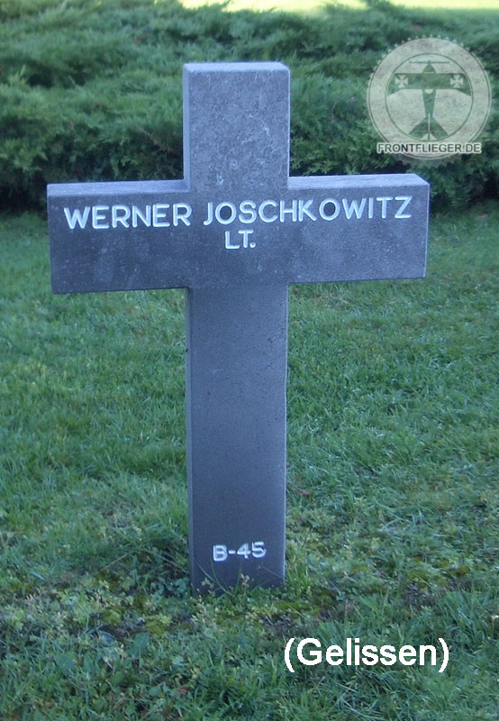 Die Maschine des Bogohl 3 wurde vor der britisch Küste abgeschossen und stürzte in die Nordsee. Nur ein Besatzungsmitglied (Bruno Schneider) konnte gerettet werden, die anderen (Walter Latowsky, Eckart Fulda und Heinrich Schildt) ertranken. Joschkowitz wurde einen Monat später an die belgische Küste gespült und dort bestattet. |