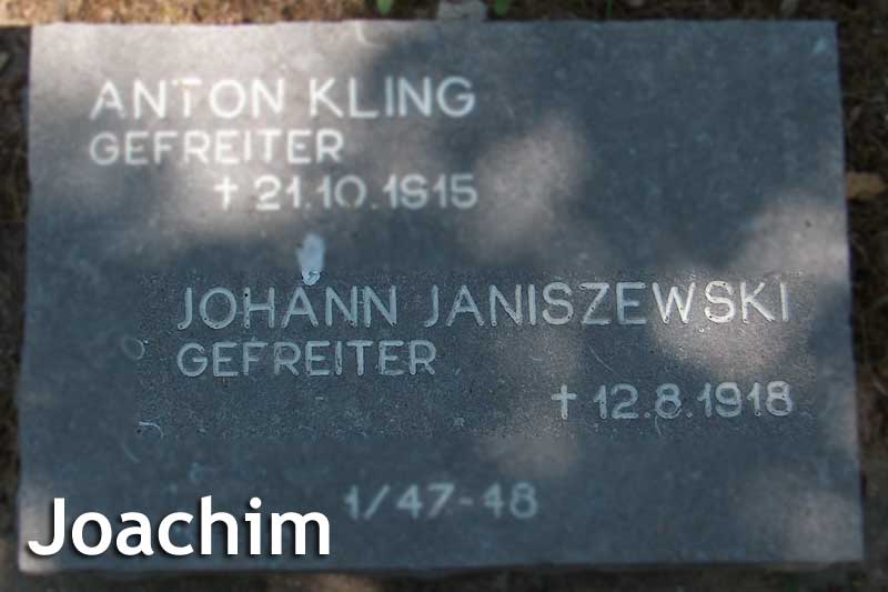 (Ortelsburg) | Er war vermutlich Angehöriger der Marine-Landflieger-Abteilung in Berlin Johannisthal, als er tödlich abstürzte. Wahrscheinlich wurde er in seine ostpreussische Heimat überführt. - Andere Quelle nennt 'Juschkat'. |