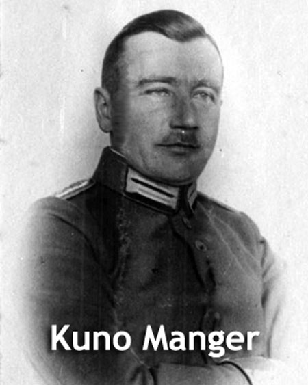 Manger erwarb die Pilotenpatent No 600. war Kommandant verschiedener Luftschiffe. Luftschiff L 62 explodierte vor Helgoland - kein Besatzungsmitglied überlebte. Manger wurde auf Norderney angespült und dann im Familiengrab bestattet. Seine Frau starb ein Jahr später an der Spanischen Grippe. |