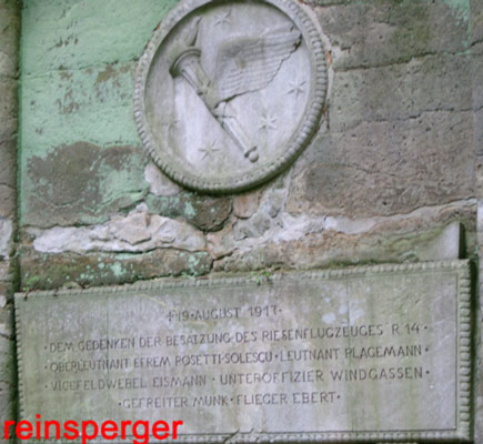 Am 19. August 1917 stürtze das Riesenflugzug R14 bei Halberstadt ab. Die gesamte Besatzung kam ums Leben: Oblt. Effrem Rosetti-Solescu, Lt. Karl Plagermann, Vfw Heinrich Eismann, Uffz. Friedrich Windgassen, Flg. Karl Ebert und Gefr. Paul Munk. Eine Gedenktafel erinnert in Klusbergen/ Halberstadt an dieses Unglück. |