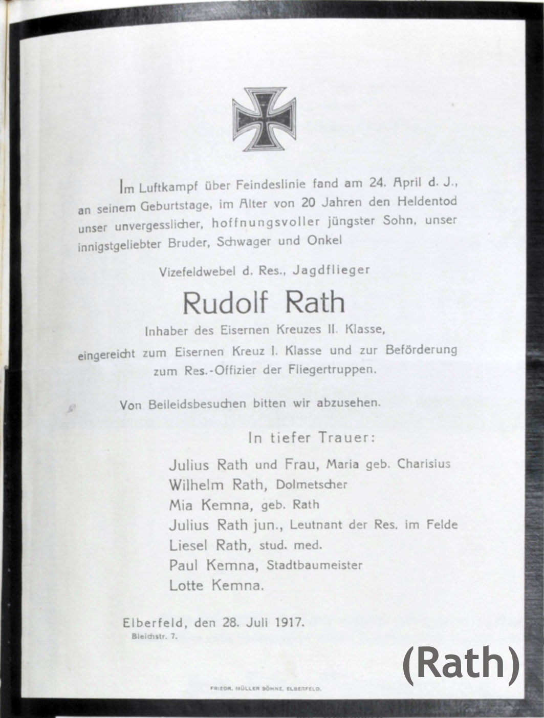 Rath, Rudolf (Vfw.) Jasta 35 b * 24.04.1897 Elberfeld + 24.04.1917 Altkirch |