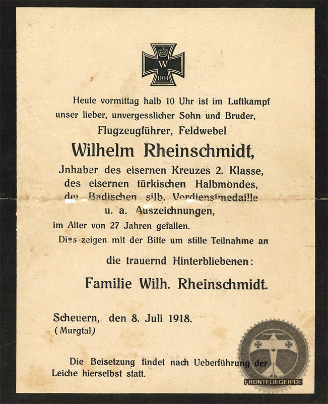 Reiche, Arthur (Flg.) FFA 68 * 02.11.1892 Merseburg + 04.08.1915 Habsheim |