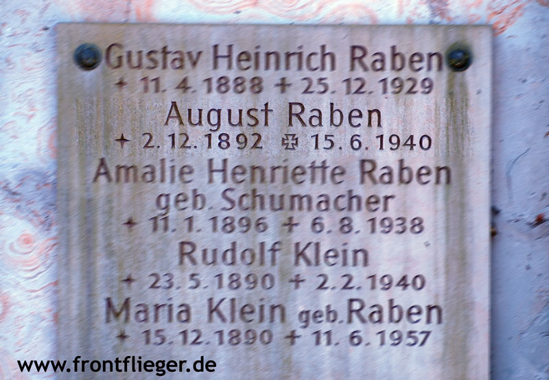 Er wurde in Törning bei Hadersleben (heute Taarningaad in Dänemark) geboren. Raben besuchte zeitweise die Oberrealschule in Oldesloe (seine Familie war in Hamburg ansässig). Im Weltkrieg war er Schutz- und Jagdflieger, Angehöriger der Jasta 36, Jasta 39 - Führer der Jasta 15 und später der Jasta 18, der 'Raben-Staffel'. Flugzeuge seiner Staffel trugen 'Raben' als Abzeichen (Beispiel: Günther von Büren). -- Zwischen den Kriegen war er Mitarbeiter der 'Afrikanischen Frucht-Compagnie AG' und wohl einige Zeit in Kamerun ansässig. -- Er fiel als Major und Bataillonskommandeur - vermutlich - bei den Kämpfen um die Maginot-Linie in Frankreich. Auf dem Ohlsdorfer Friedhof in Hamburg ist sein Name auf dem Familiengrab vermerkt. |