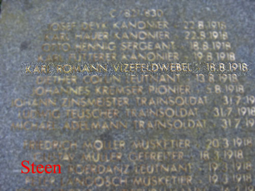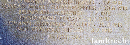 - vermisst - | Denkmal | Von der Jasta-Schule Nivelles kommend, flog er bei dieser Staffel. Von einem Jagdflug kehrte er nicht zurück, gilt seither als vermisst. |