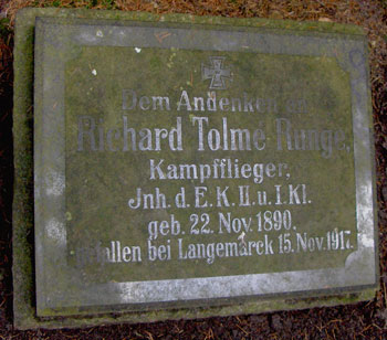 (vermisst) | Richard Runge flog den Albatros D Va 5253/17 und wurde von einem SE5 brennend bei Langemark- Poelkapelle abgeschossen. Ein Stein auf dem Ohlsdorfer Friedhof/ Hamburg erinnert an ihn. |