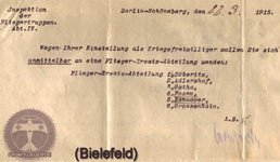 Im März 1915 fragte Ernst Bielefeld bei der Inspektion der Fliegertruppen in Berlin an, ob diese noch Kriegsfreiwillige annehmen würden. Als Antwort erhielt er eine Mitteilung, welche Flieger-Ersatzabteilung wo stationiert war. Er ging nach Hannover (zur FEA 5) und ließ sich zum Flugzeugführer ausbilden. |