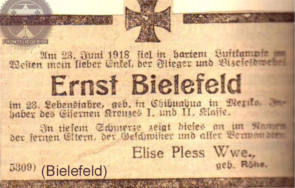 Ab etwa Februar 1918 diente er bei der Jagdstaffel 60 unter der Führung von Kurt von Rudno-Rudzinski, welcher allerings Ende Mai 1918 in Kriegsgefangenschaft geriet. Am 23. Juni 1918 geriet Ernst Bielefeld in einen Luftkampf mit der französischen Staffel SPA87 und wurde - wahrscheinlich - durch Lucien Gassner tödlich verwundet. Ernst Bielefeld ruht heute auf der deutschen Kriegsgräberstätte Berru/ Marne in Frankreich. |