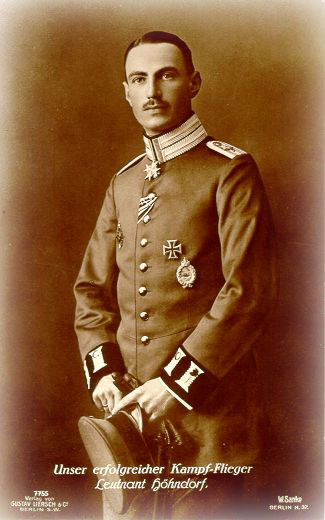 Bei Kriegsausbruch meldete sich Walter Höhndorf freiwillig, wurde im März 1915 zum Leutnant der Reserve befördert. Er diente bei verschiedenen Frontabteilungen (FFA 12, FFA 67) und in der Heimat, bei den Siemens-Schuckert-Werken als Einflieger. Auch beim KEK Vaux flog er (im Juli 1916) gemeinsam mit Rudolf Berthold, Kurt Wintgens usw. Er erhielt den Orden Pour le Mérite im Juli 1916. Nach einer weiteren Heimatverwendung und einer Zeit als Fluglehrer bei der Jagdstaffelschule in Valenciennes wurde ihm im August 1917 die Führung der Jagdstaffel 14 übertragen. Am 05. September 1917 testete er eine (eigenkonstruierte) AEG D I 4400/17 mit der er bei Ire-le-Sec (in der Nähe von Marville) tödlich abstürzte. ![]() In Parade-Uniform eines Fliegertruppenangehörigen. |