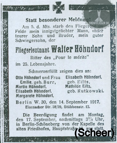 ![]() Das Grab existiert heute nicht mehr. Der Bruder, Martin Höhndorf, soll ebenfalls bei den Fliegern gedient haben. |
