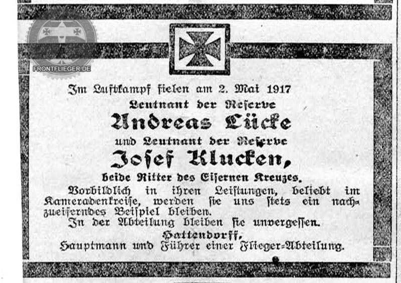 Am 2. Mai 1917 flogen beide einen Aufklärungseinsatz und wurden - laut Augenzeugen - von drei französischen Jagdfliegern
