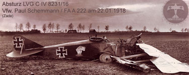 Vfw. Paul Schemmann stürzte am 22. Januar 1918 tödlich mit der LVG C IV 8231/16 ab. Interessant ist das 'Nilpferd' auf der Seite des Flugzeugrumpfes. |