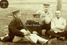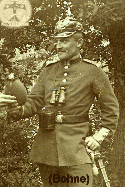 Bei Kriegsausbruch war Arthur Bohne unter anderem als Kompanieführer im Infanterie-Regiment 166 (das Regiment gehörte zum XXI. Armeekorps) an der Westfront eingesetzt. Nach einer Verwundung in Lothringen und einem anschließenden Lazarettaufenthalt war er von Dezember 1914 bis März 1915 bei der Heeresverwaltung in Oberursel (in der Nähe von Frankfurt/ Main) bei der Prüfung von Flugzeugmotoren eingesetzt. |