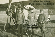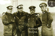 Ausbildung zum Flugzeugführer: Bereits in dieser Zeit - Frühjahr 1915 - wurde er in Darmstadt-Griesheim (bei der Fliegerersatz-Abteilung 9) zum Flugzeugführer ("Emil" in der Fliegersprache) ausgebildet. Einen zweiten Teil seiner Ausbildung erfuhr Bohne bei der FEA 3, die seit Februar 1915 in Gotha stationiert war. Am 28. April 1915 absolvierte Arthur Bohne seinen ersten Alleinflug in Gotha. Während der Ausbildung kam es damals regelmäßig zu oftmals tödlichen Abstürzen. Er legte seine Prüfung zum Flugzeugführer am 10. Mai 1915 erfolgreich ab. Leiter der Fliegerschule in Gotha war Oberleutnant Karl Braun (Dragoner-Regiment Nr. 9 - am weißen Mützenband gut erkennbar). Braun hatte seine Fluglizenz (Nr. 155) bereits 1912 erworben. |