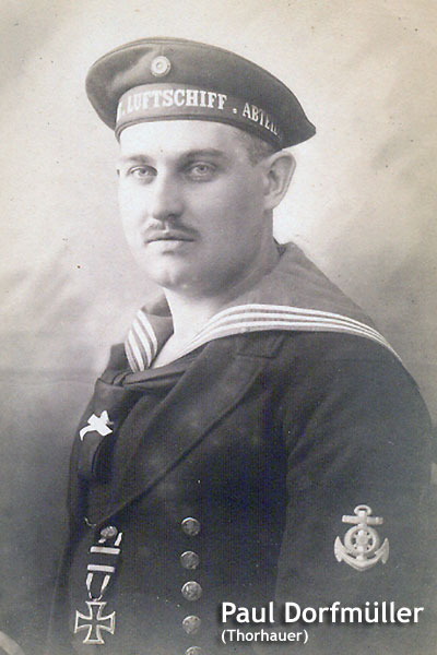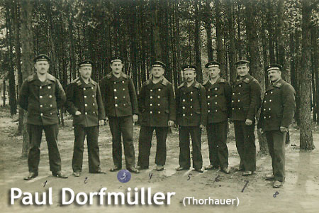 | Paul Dorfmüller (Nr. 3) während seiner Ausbildungszeit in Dresden. Der Text der Rückseite lautet: 'Zum Andenken an meine Ausbildung in Dresden zur Fahrausbildung auf einem Zeppelinluftschiff, Kriegszeit 1914 - 1915, 27.April 1915 Die acht technischen Unteroffiziere der VII. Fahrbesatzung 1. Masch. Maat [Georg] Hagedorn 2. Masch. Maat Greve 3. Masch. Maat Dorfmüller 4. Masch. Maat Luck 5. Masch. Maat Berger 6. Masch. Maat Trümpener 7. Masch. Maat Zerres 8. Masch. Maat Wunsch |