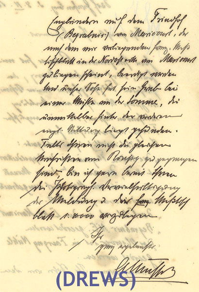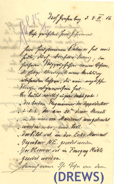 Wenige Tage später wurde eine Mitteilung hinter der deutschen Front abgeworfen und an den Vater des gefallenen Beobachungsoffiziers weiter geleitet. Dieser wendet sich schriftlich an Vater Groß. |
