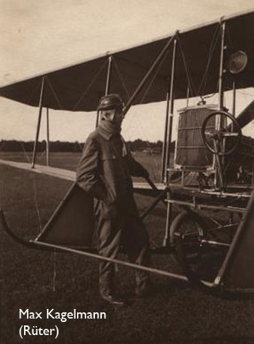 | Im Krieg diente Max Kagelmann bei der Fliegertruppe - Details sind noch nicht bekannt. Er stürzte 1915 bei Funk-Versuchen mit dem Flugzeug ab und verletzte sich schwer (Bruch beider Arme und Beine). Erst 1917 konnte er das Lazarett wieder verlassen. - Den restlichen Krieg tat er als 'Feld-Telegraphensekretär' im Großen Hauptquartier Dienst. |