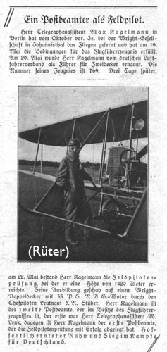 | Max Kagelmann ließ sich zwischen Oktober 1913 und Ende Mai 1914 zum Flugzeugführer ausbilden. Er lernte bei der Wright-Gesellschaft auf dem Flugplatz Johannisthal bei Berlin. Am 20. Mai 1914 legte er die Flugzeugführerprüfung erfolgreich ab und erhielt das Fliegerpatent Nr. 769. Zwei Tage später bestand er auch die Feldpilotenprüfung - und war somit der erste Reichspostbeamte, der ein Militär-Flugzeug führen durfte. |