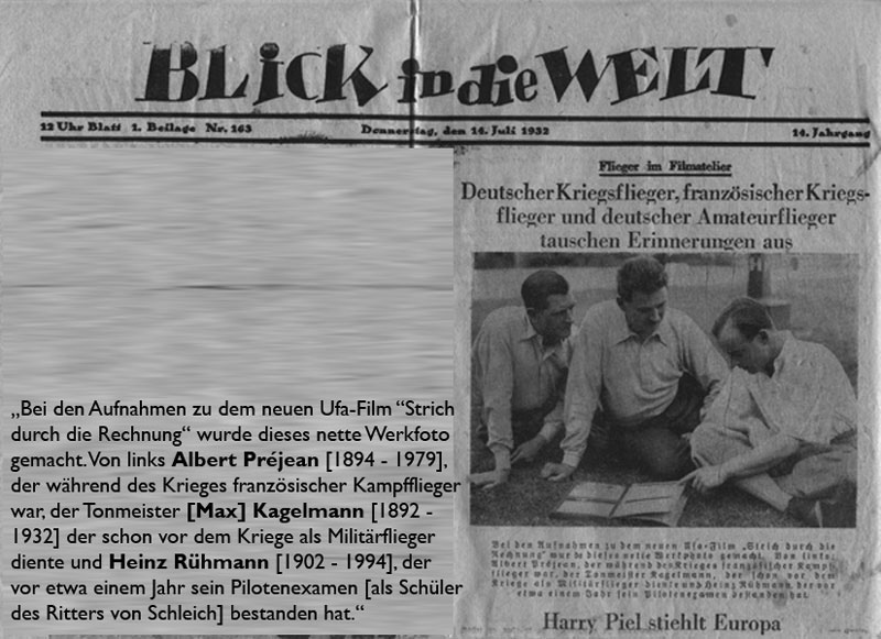 | Nach dem Krieg heiratete Max Kagelmann 1919 und wurde 1920 Vater einer Tochter. Er ging wieder zur Reichspost, in das Telegraphentechnische Reichsamt und schied 1924 auf eigenen Wunsch aus dem Dienst aus. Versuche, zum Rundfunk zu wechseln, schlugen fehl. Von 1927 bis 1929 arbeitete er in Entwicklungsabteilungen der C. Lorenz AG. Ab 1930 arbeitete er als Tonmeister bei der 'Universum-Film AG' besser bekannt unter ihrer Abkürzung: Ufa. Bis zu seinem Tod war er an vielen Filmproduktionen für das In- und Ausland beteiligt. Das Foto zeigt ihn (in der Mitte) mit dem französischen Schauspieler Albert Préjean (1894 - 1979, franz. Kampfflieger der SPA73) und dem deutschen Schauspieler Heinz Rühmann (1902 - 1994) bei Dreharbeiten zum Film 'Strich durch die Rechnung' (1932). |