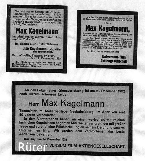 | Todesanzeigen der Familie und der Universum Film Aktiengesellschaft (Ufa) |