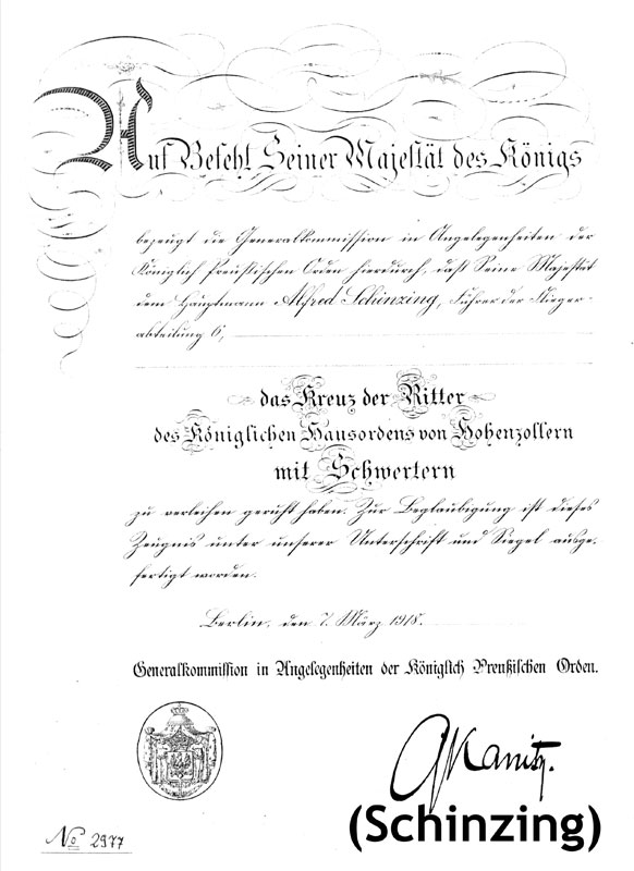 Alfred Schinzing wurde am 25. Mai 1884 in Heidelberg als Sohn des Rittmeisters Gustav Schinzing und dessen Frau Maria, geborene von Kurowska, geboren. Im Alter von 19 begann er seine militärische Karriere. Im Krieg war er Beobachter bei der Fliegertruppe, ab August 1916 schließlich Führer verschiedener Abteilungen. Er starb 1936 - im Alter von 52 Jahren.