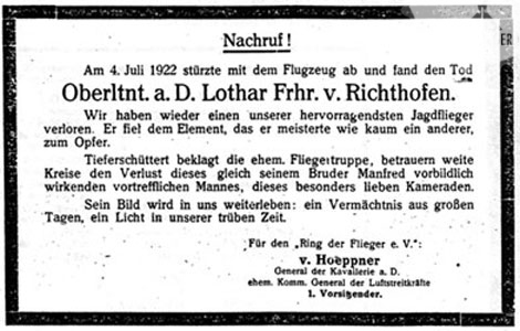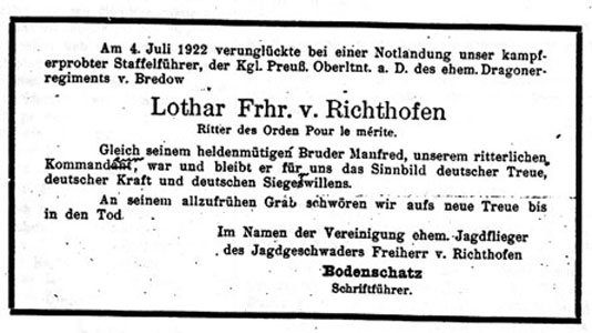 Le Chatelet, 8. Mai 1916 -- Manfred besuchte mich auf eine Stunde. Es war sehr nett, sich hier im Felde mal wiederzusehen. Einige Tage darauf schoss er einen Franzmann ab. Leider ist mir dies noch nicht gelungen, obgleich ich auch schon einige Luftkämpfe hinter mir habe. Einmal [28. April 1916] rettete ich eins unserer Flugzeuge aus den Klauen zweier Franzosen. Der Beobachter, ein Leutnant