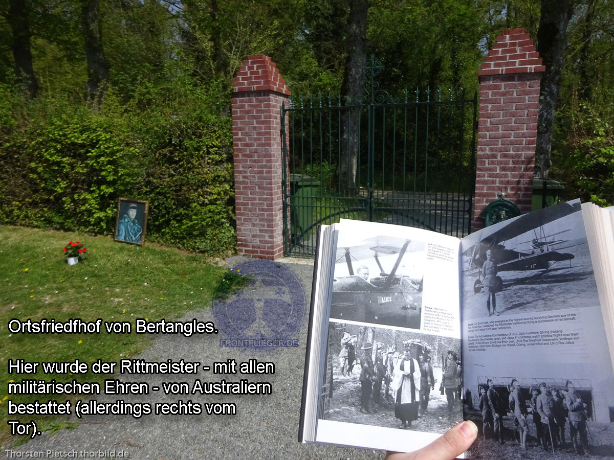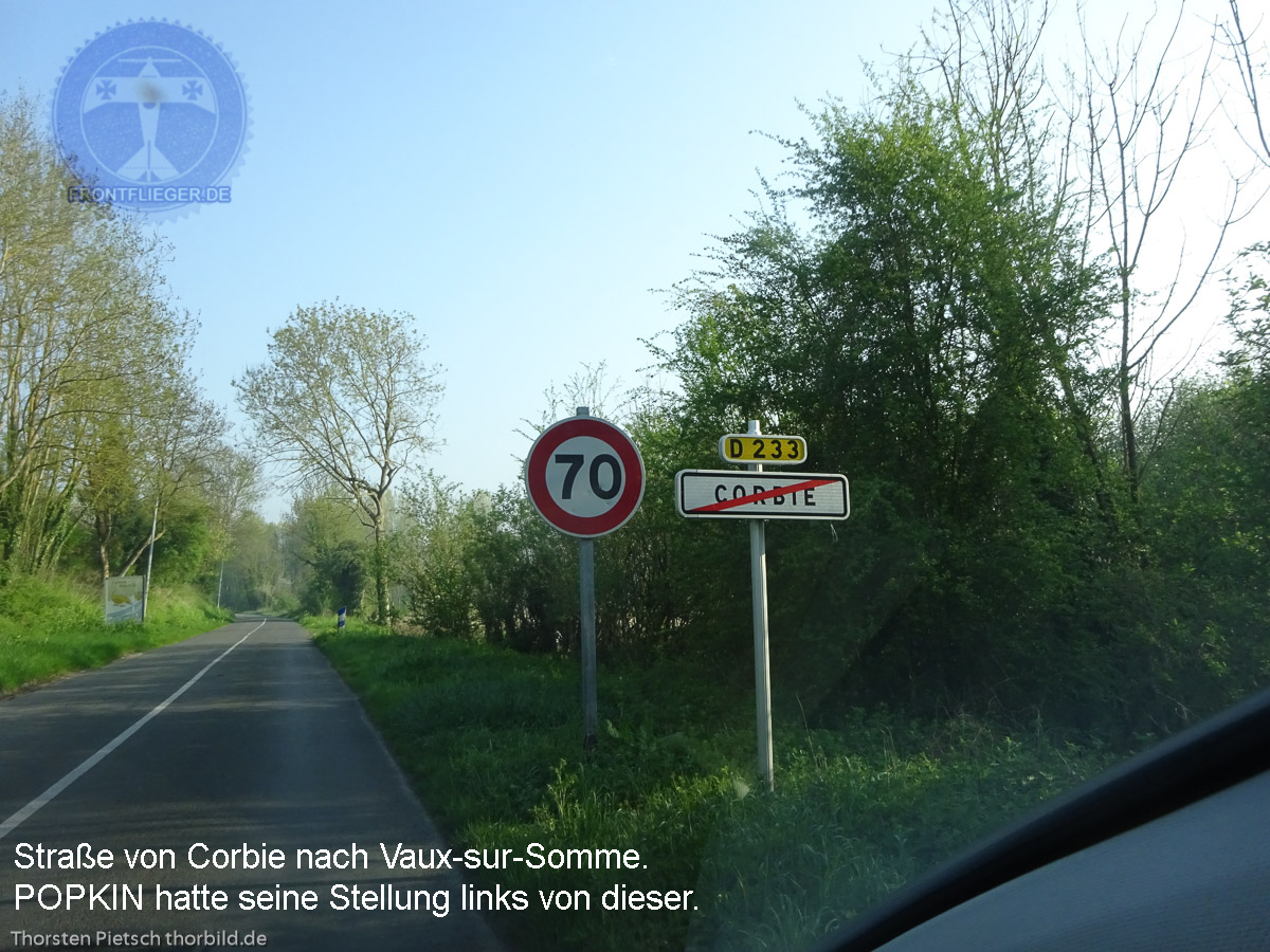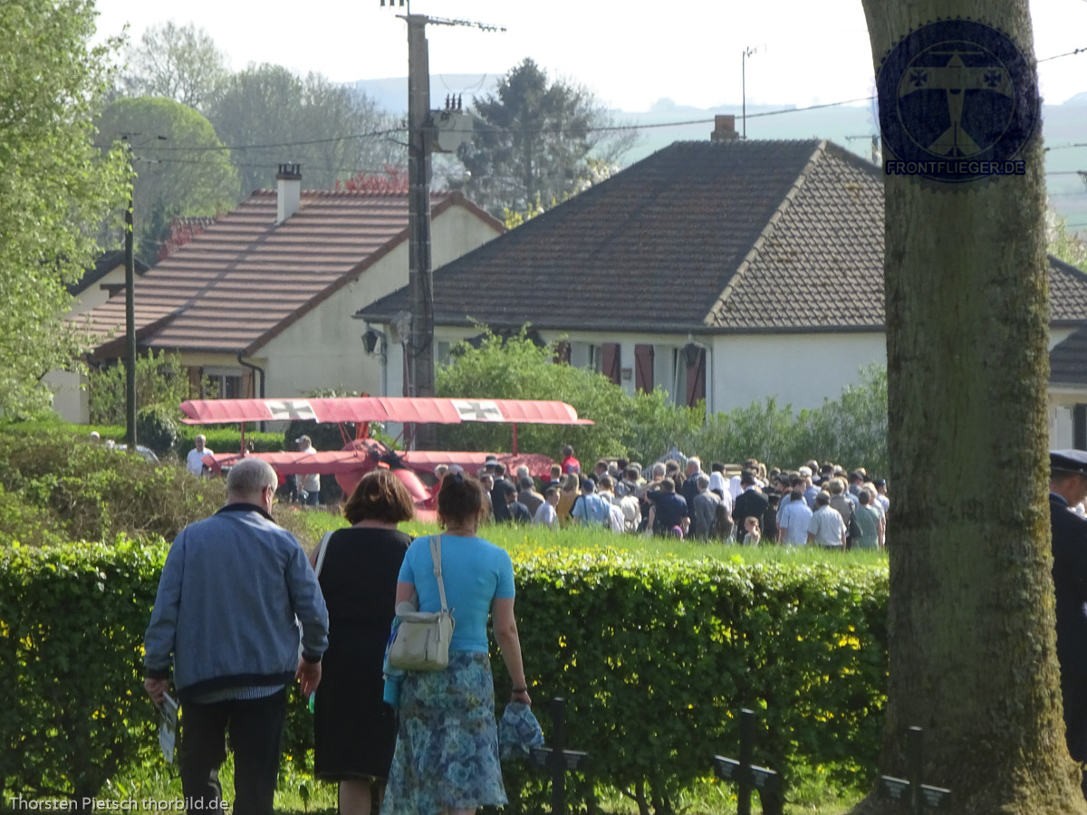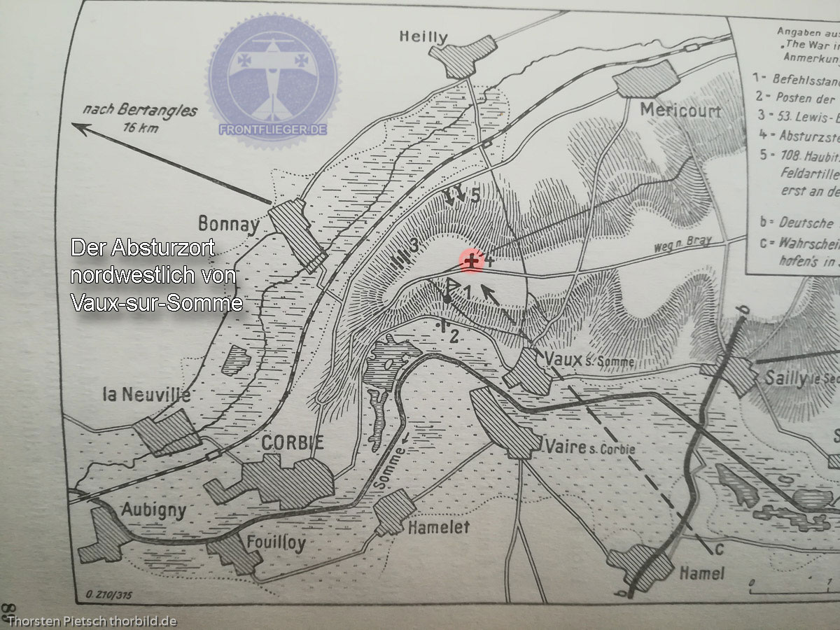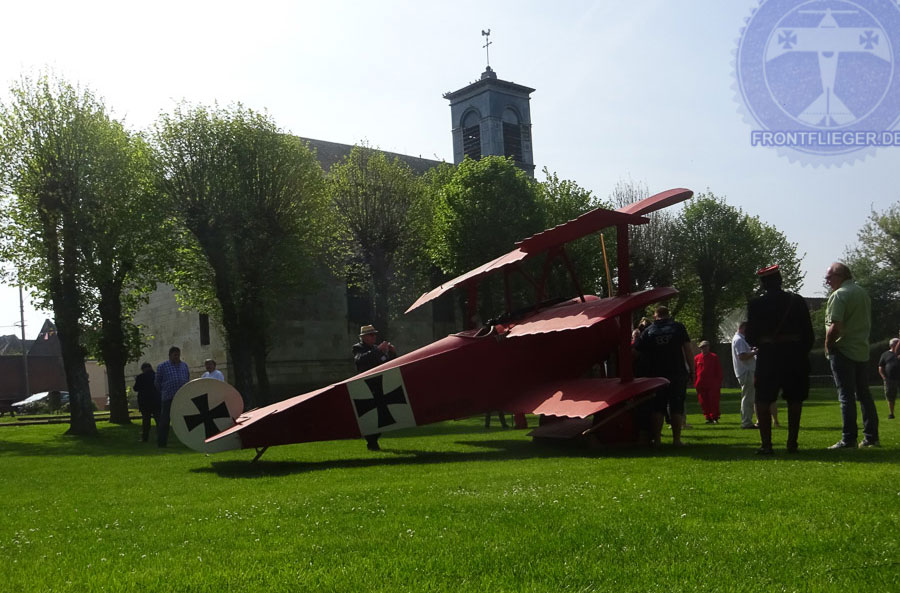 Fokker Dr I vor der Kirche von Vaux-sur-Somme. Bei seiner Verfolgung des Kanadiers May wäre von Richthofen beinahe gegen den Turm geflogen (und brach damit seine eigenen Regeln).