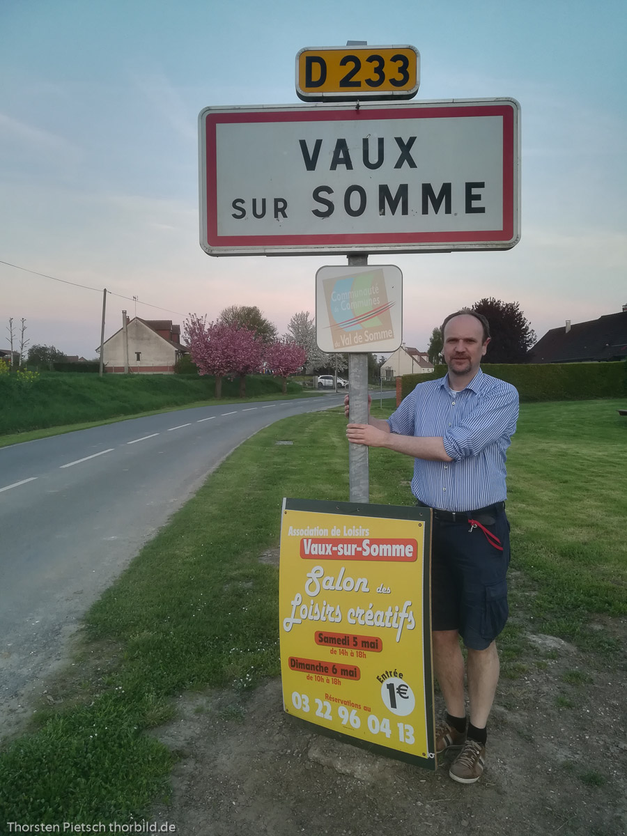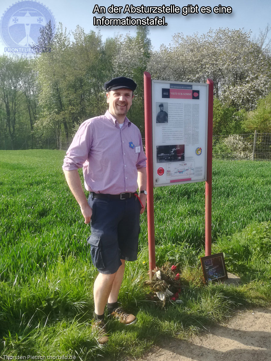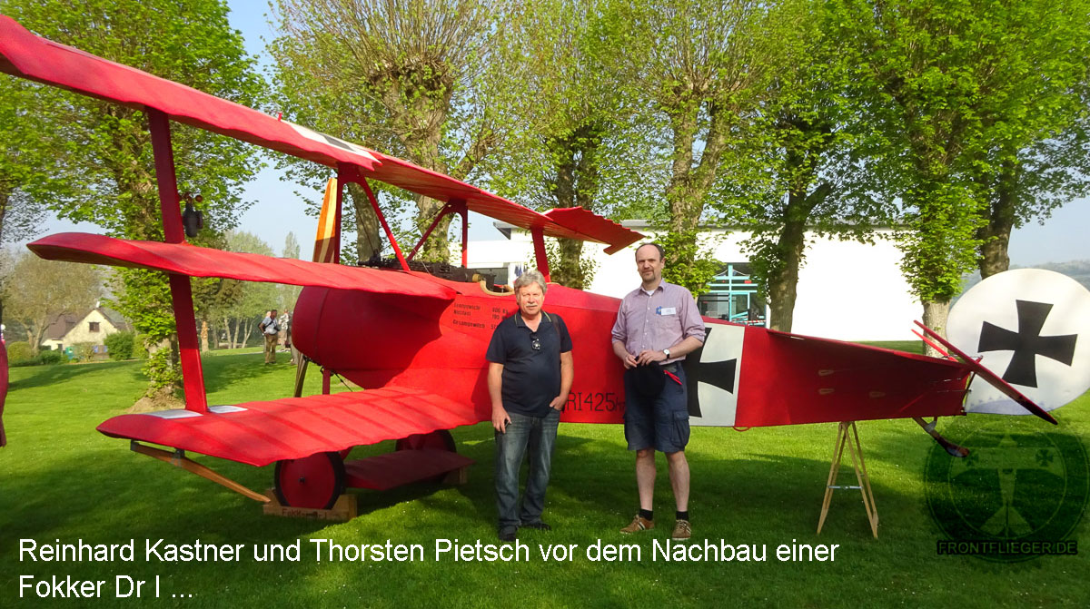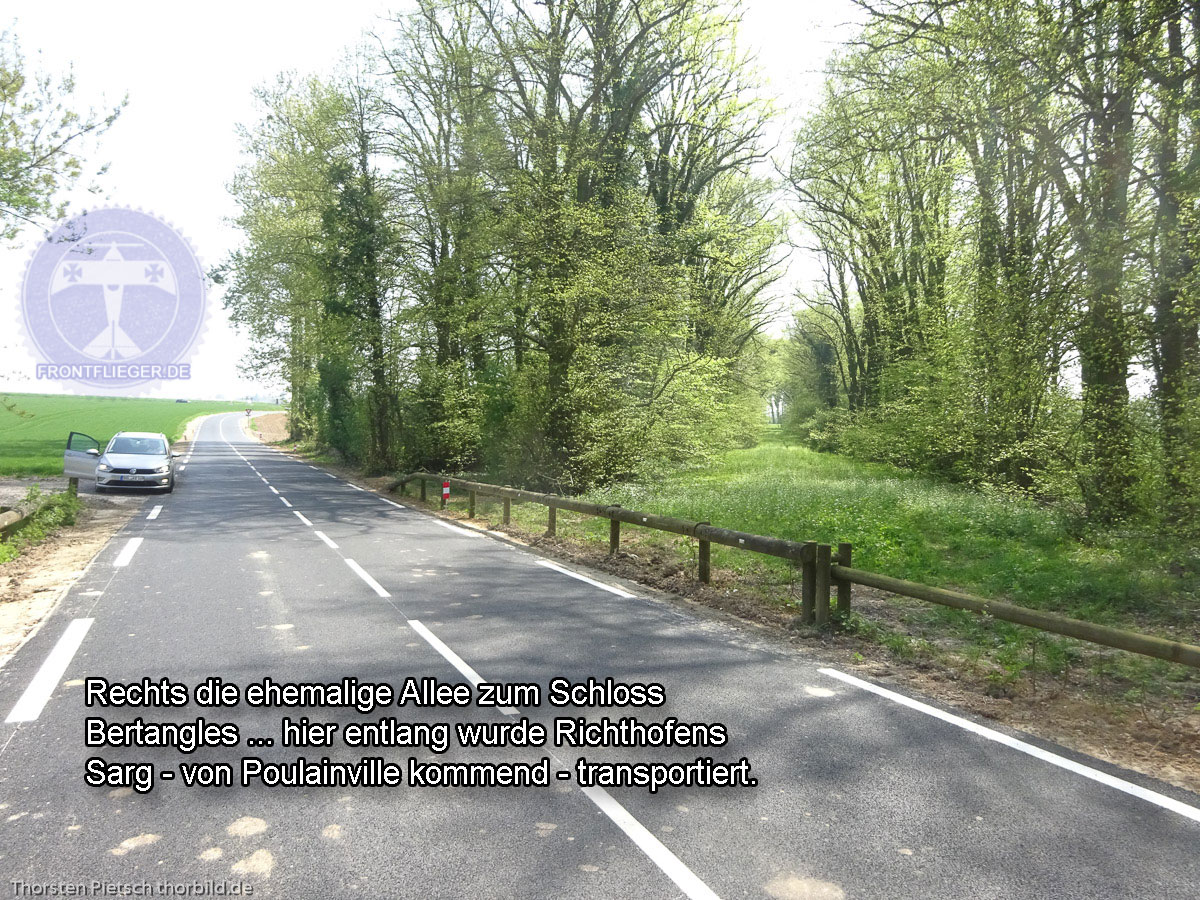 Fokker Dr I vor der Kirche von Vaux-sur-Somme. Bei seiner Verfolgung des Kanadiers May wäre von Richthofen beinahe gegen den Turm geflogen (und brach damit seine eigenen Regeln).