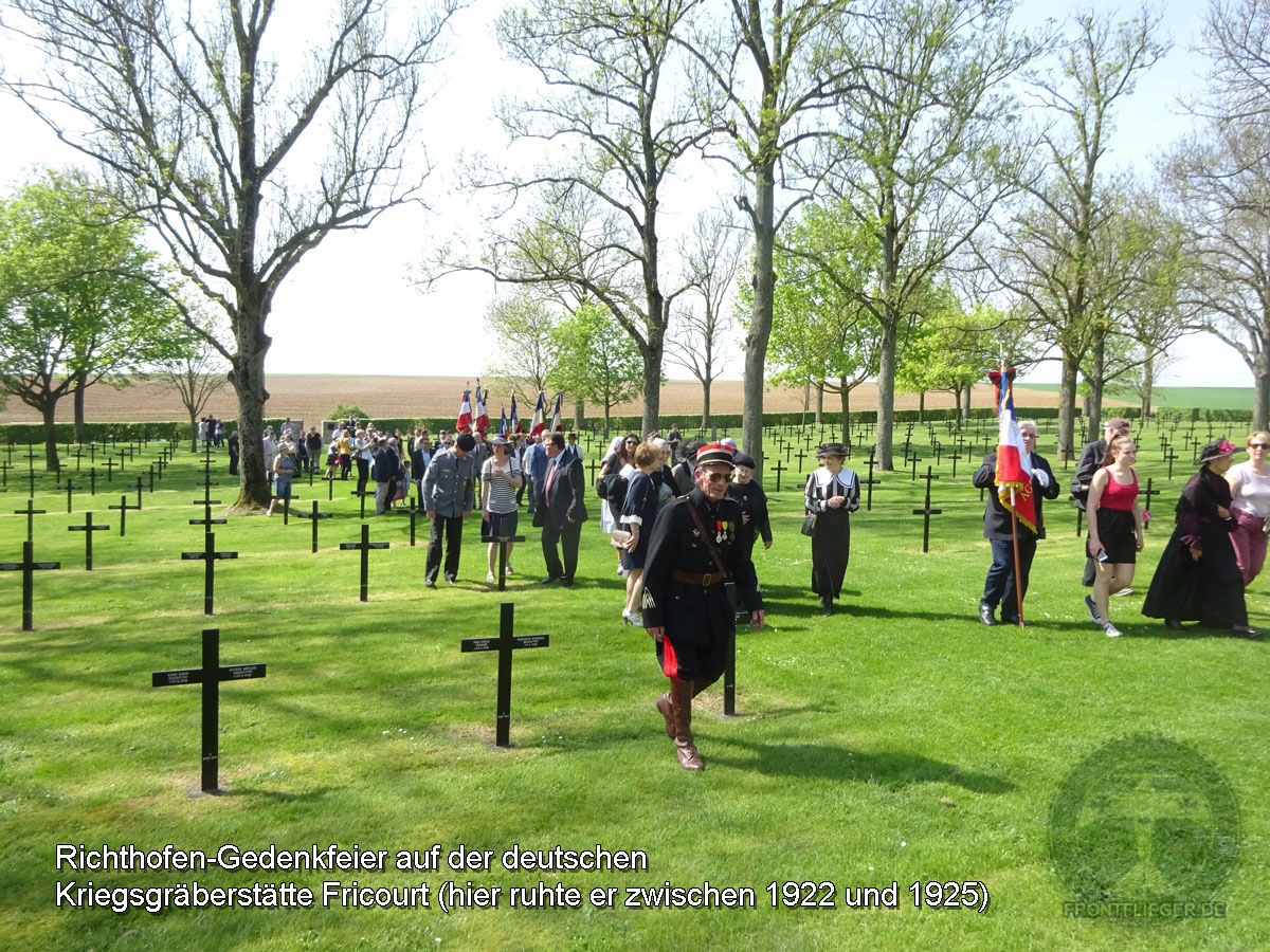 Hier sammeln sich zivile Teilnehmer, Soldaten, offizielle Teilnehmer, die Familie und so weiter auf der Kriegsgräberstätte Fricourt (dem zweiten Bestattungsort des Rittmeisters).